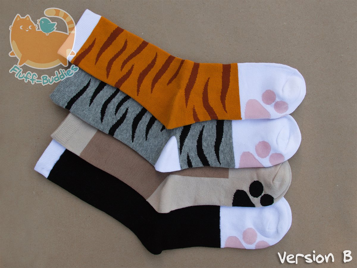 Our other Paw Socks have two Versions (A & B) from different production runs. These have slight colour variations between them. Our Tabby Orange Paw Socks will match with Version B!